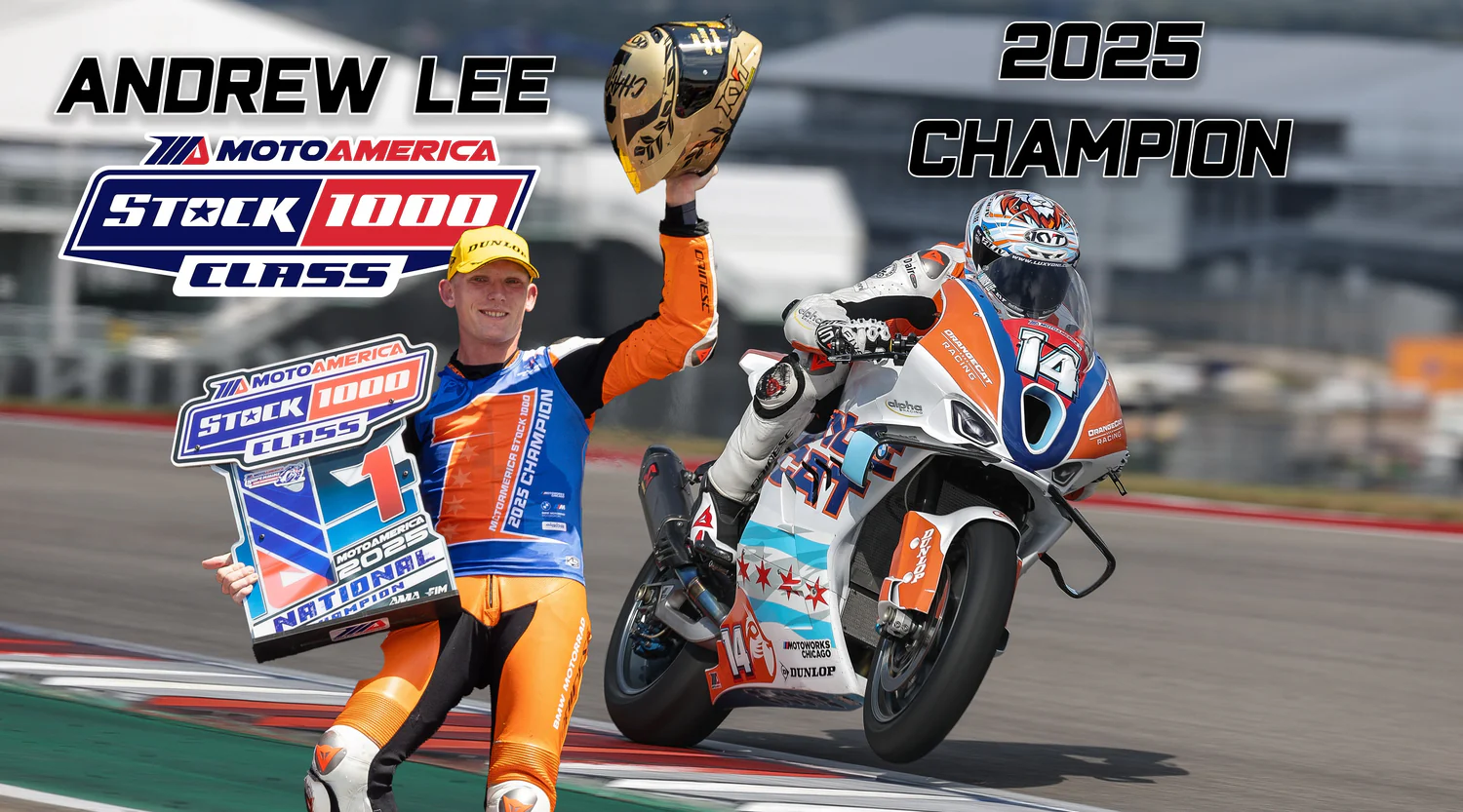Andrew Lee culminó una temporada implacable al conseguir el título de MotoAmerica Stock 1000 2025 en el Circuito de las Américas, sumando así su tercera corona nacional y reafirmando su estatus como uno de los mejores pilotos de motos de litro de Estados Unidos. Lee había ganado dos campeonatos consecutivos de MotoAmerica Stock 1000 en 2018 y 2019, y llegó a 2025 con OrangeCat Racing a bordo de una BMW M 1000 RR, consolidándose rápidamente como líder en puntos y cerrando el año en la cima.